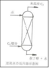 異丁烯水合制取叔丁醇的工業裝置有并流和逆流兩種類型。其中并流裝置是將含有異丁烯的C4與水混合后,從上部進入裝有樹脂催化劑的反應器,由于反應物、產物之間的濃度梯度較小,加之液態烴與水的混溶性很差,導致異丁烯的轉化率僅為60~70%左右。為改善物料間的相溶性,在水中添加C4“增溶劑”,可以使異丁烯的轉化率提高到70~80%左右。逆流裝置是將含有異丁烯的C4從反應器底部進入,水相從反應器頂部進入,加大了反應物、產物之間的濃度梯度,異丁烯的轉化率可達90%以上,選擇性為99.5%以上。